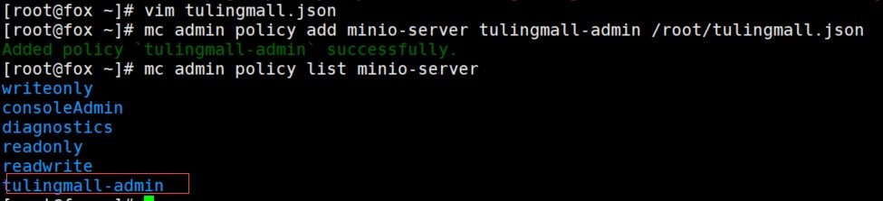 mc admin policy add minio-server tulingmall-admin /root/tulingmall.json