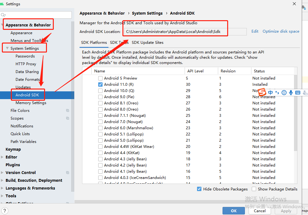 - 第三步:Appearance&Behavior -> System Settings -> Android SDK
