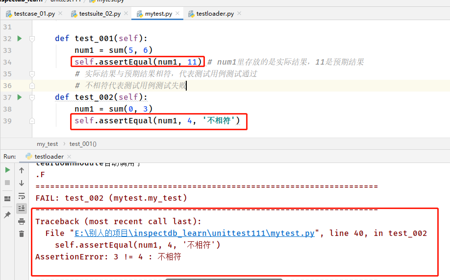 - 所有的断言方法都有一个msg参数,如果指定msg参数的值,则将该信息作为失败的错误信息返回