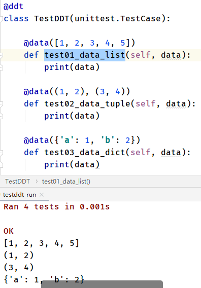 - Data-Driven Tests(DDT)即数据驱动测试,可以实现不同数据运行同一个测试用例。ddt本质其实就是装饰器,一组数据一个场景