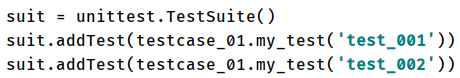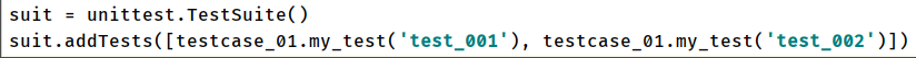 # suite:为TestSuit实例化的名称- 添加用例的方式