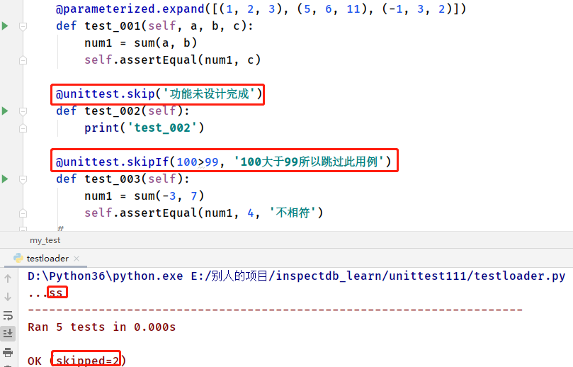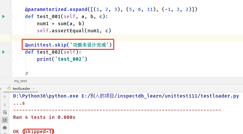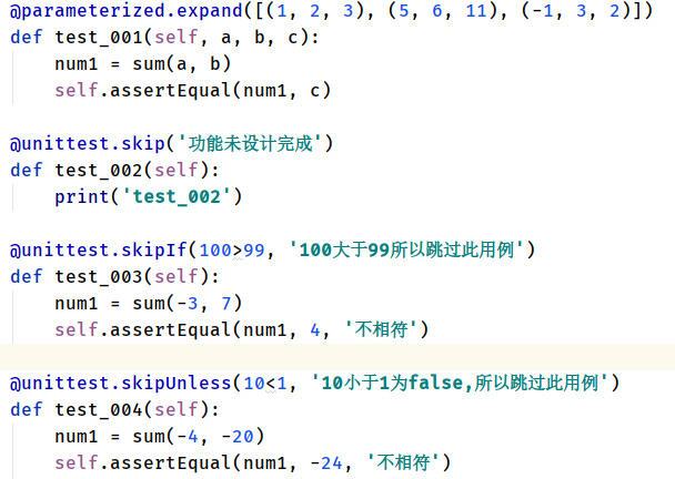 - 对于一些未完成的或者不满足测试条件的测试函数和测试类,可以跳过执行