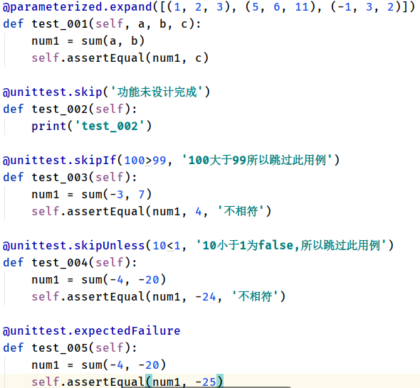 - 如果失败了则跳过;在断言用例执行结果时,会出现预期结果与实际结果不一致的情况,此时我们明确知道用例执行结果为FAIL;被装饰器@unittest.expectedFailure标记用例,失败不会抛异常