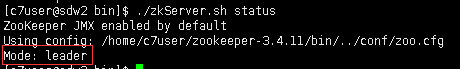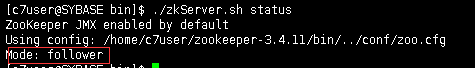 注意红框中的提示语。代表当前节点zookeeper服务的角色。能看到上述提示的则表示启动成功。