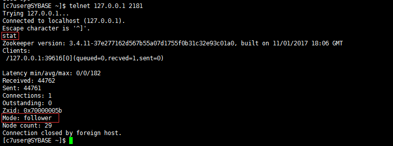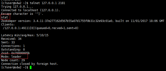 分别在3台主机上telnet 127.0.0.1 2181 后通过stat来查看。
