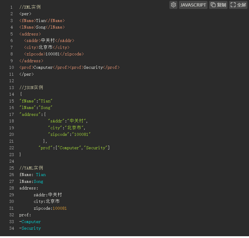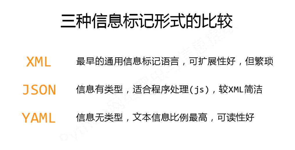 1、举例信息标记XML、JSON和YAML三种形式?并进行比较说明。