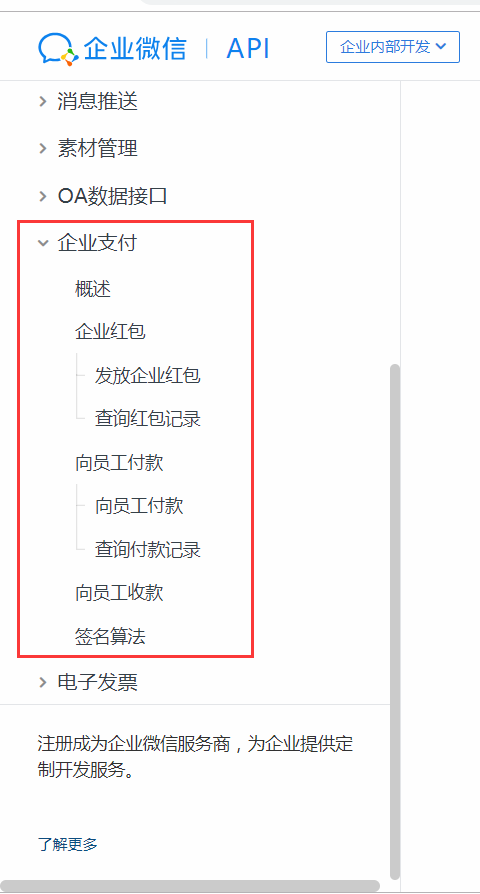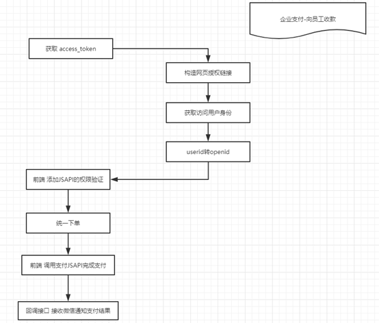 按文档介绍,第一步,开通企业微信专区。第二步,获取用户openid。第三步,添加JSAPI的权限验证。第四步,发起向员工收款。第五步,调用支付JSAPI完成支付。