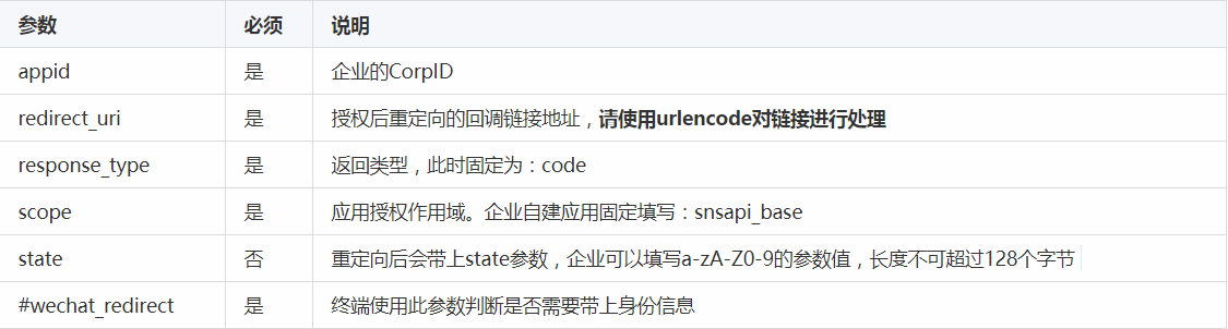 这里state是选填的,但是一般还是带上,企业微信会原样返回你给的参数,可以拿这个区分自己是通过哪个方法去请求网页授权的。redirect_uri需要用urlencode处理。构造好网页授权地址后,访问后,页面会跳转到redirect_uri给的地址,并带上code和原样返回的state参数。拿到code后我们就可以用code获取userid了。(注意:code只有5分钟的有效期,并且只能使用一次)