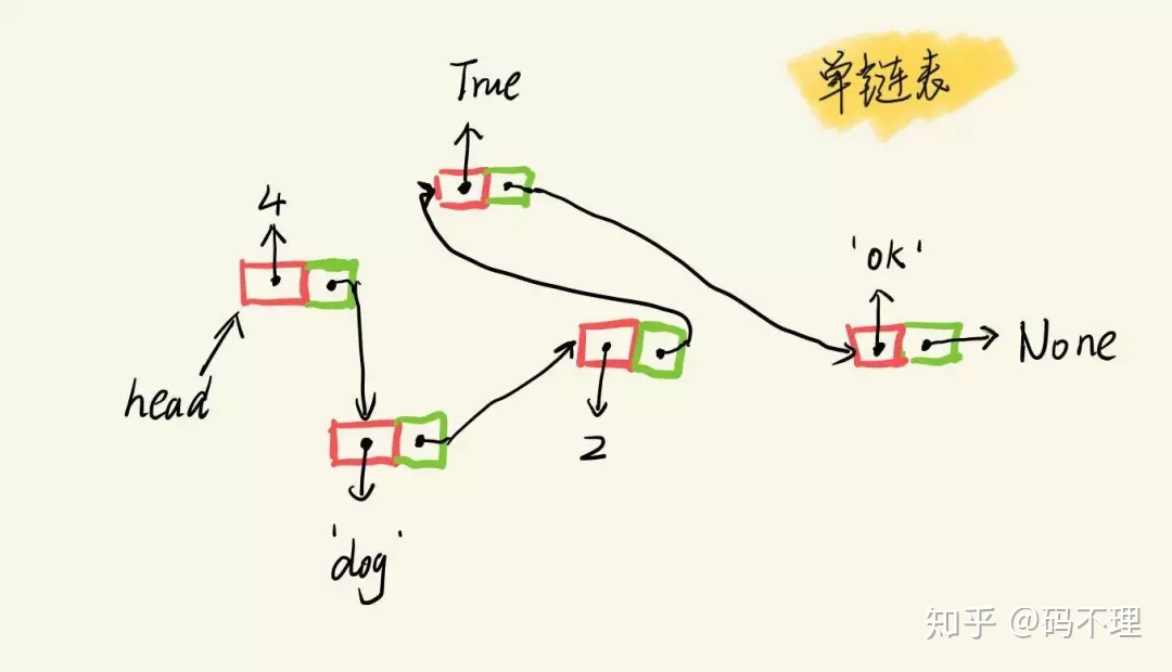 通常,我们会有一个 head 引用指向链表的开头,而链表的结尾,下一个节点则指向空值 None。
