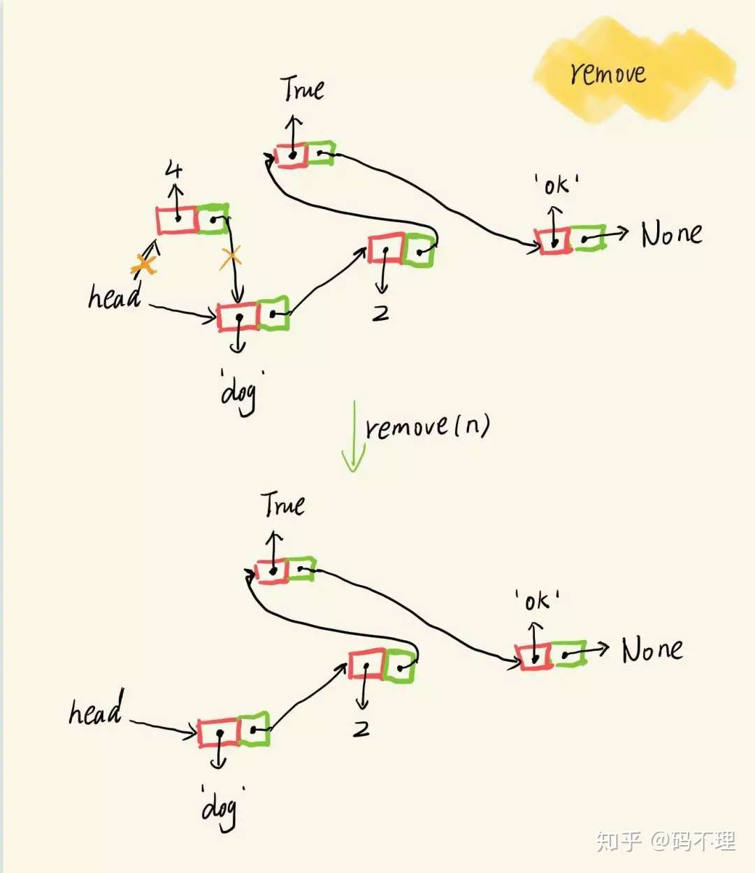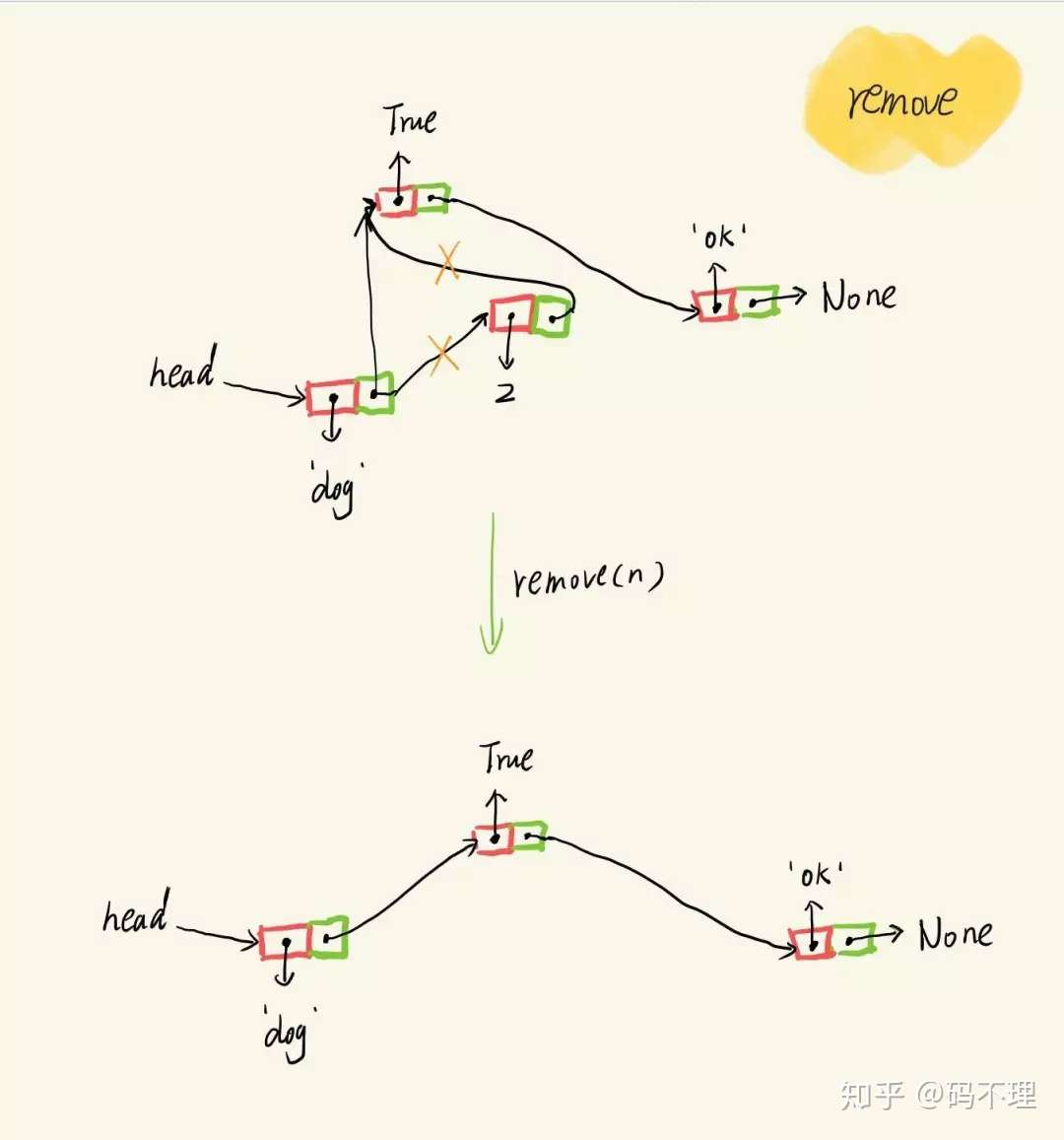 2. 当找到元素后,将其前一个节点的 next 节点指向它原本的 next 节点,也就实现了从列表中删除元素