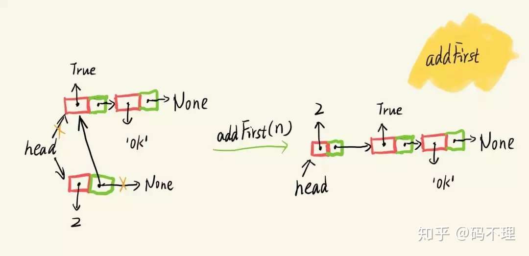 - addFirst(item) - 将元素添加到链表头,需要参数,无返回值。
