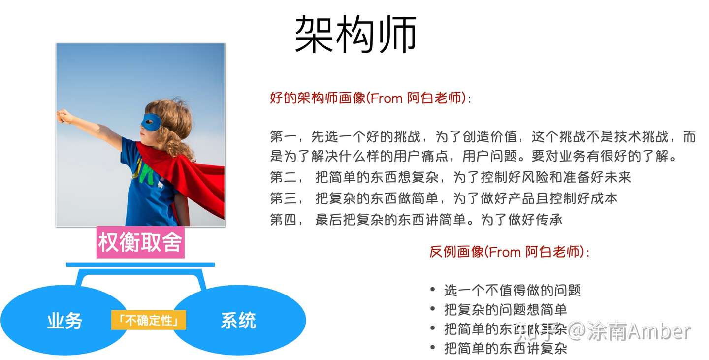 这是来自于阿白老师的文章《架构师到底是做什么的?》,越是琢磨,越觉得深以为然。其中提到了好的架构师的画像和不好的画像,如下图,与大家共勉。