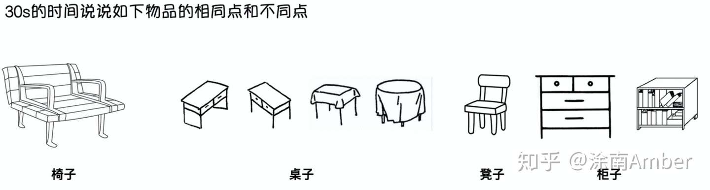 如图中已经标注的,我们从功用的角度对它们定义了椅子、桌子、凳子和柜子这样的区分,但显然很有很多很多角度,比如:物料、文字、高矮等等维度,从不同维度看过去,会有完全不同的相同点和不同点表述,所以,本质是什么?本质是: