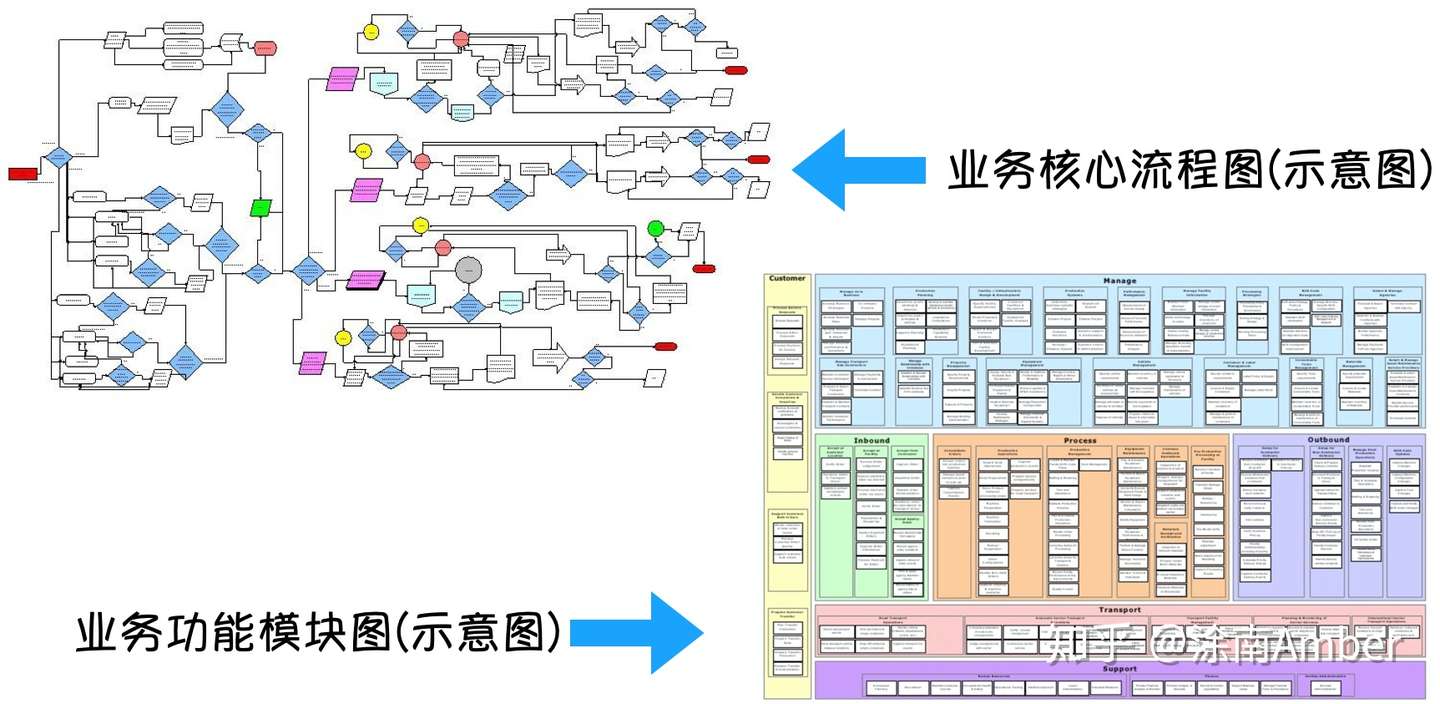 回到当下业务本身,对我而言也是全新的,在最初接触的时候凭仅有的行业背景去理解,结合了大量的文档阅读最终产出了如下图示的《业务核心流程图》和《业务功能模块图》。这两张图基本上就涵盖了所有的业务内容。左边的业务流程图得到了这个行业 20 多年从业经验专家认可,他认为这就是 20 多年所从事的业务内容。