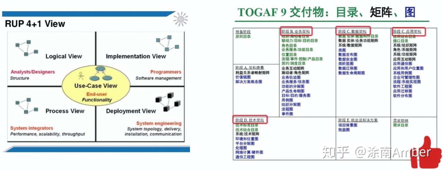 在 EA 架构领域,有两种常见架构方法 RUP 和 TOGAF,这两个框架也是我们常常了解架构分类的两个维度。从个人的角度,我自己觉得 TOGAF 的分类方式更加广泛使用(如下右图)。