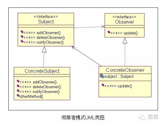 其中 Subject 是被观察者接口,即上文提到的 Observable ,持有一个观察者接口集合的引用,定义了观察者的添加、删除以及提醒;