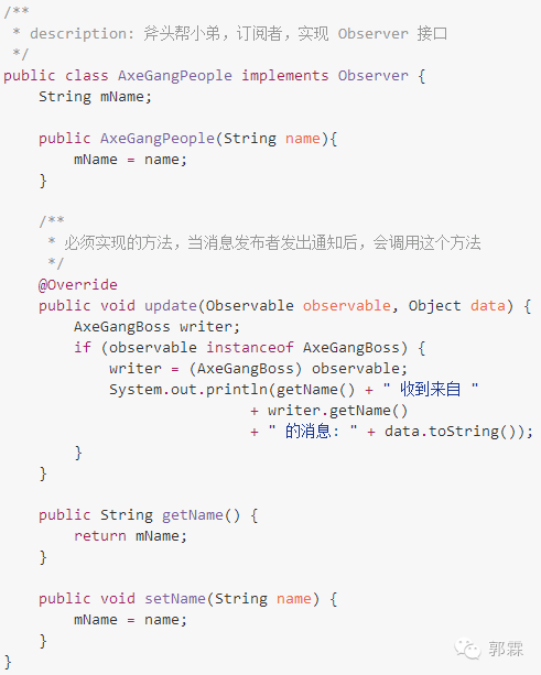 2. 定义斧头帮小弟 AxeGangPeople,小弟需要按规矩来,实现 Observer 接口: