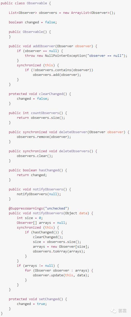 Observable 里保存着一个 Observer 的集合,然后提供了添加、删除、提醒等方法。其中重要的是 notifyObservers(…) 方法,当确定出事了(changed 为 true)时 ,挨个通知小弟。