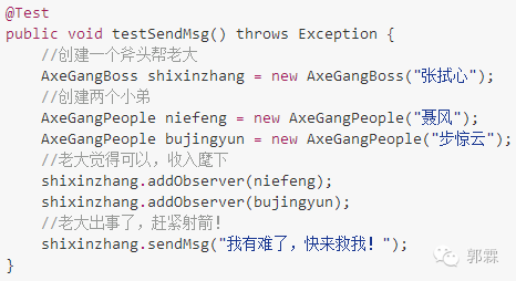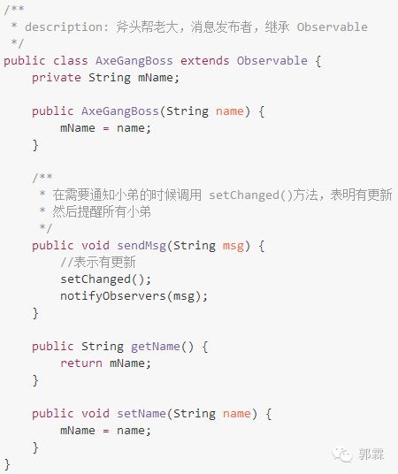 斧头帮老大是消息发布者,当有情况时就调用 sendMsg(…) 方法给小弟发消息。他继承自 Java 源代码提供的 Observable :