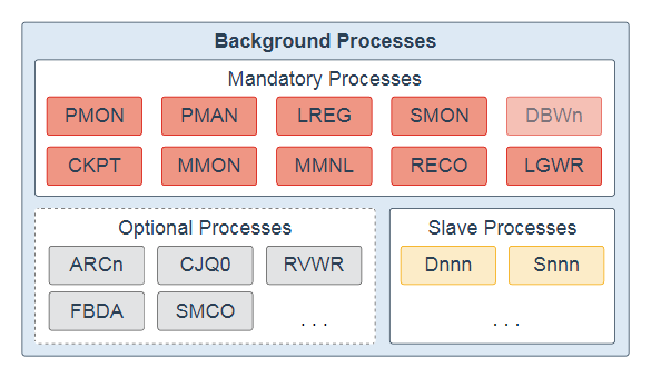 ⼤多数可选的后台进程特定于任务或功能。⼀些常见的可选过程包括归档进程 (ARCn),作业队列协调进程 (CJQ0),恢复写入进程 (RVWR),闪回数据存档进程 (FBDA) 和空间管理协调进程 (SMCO)。