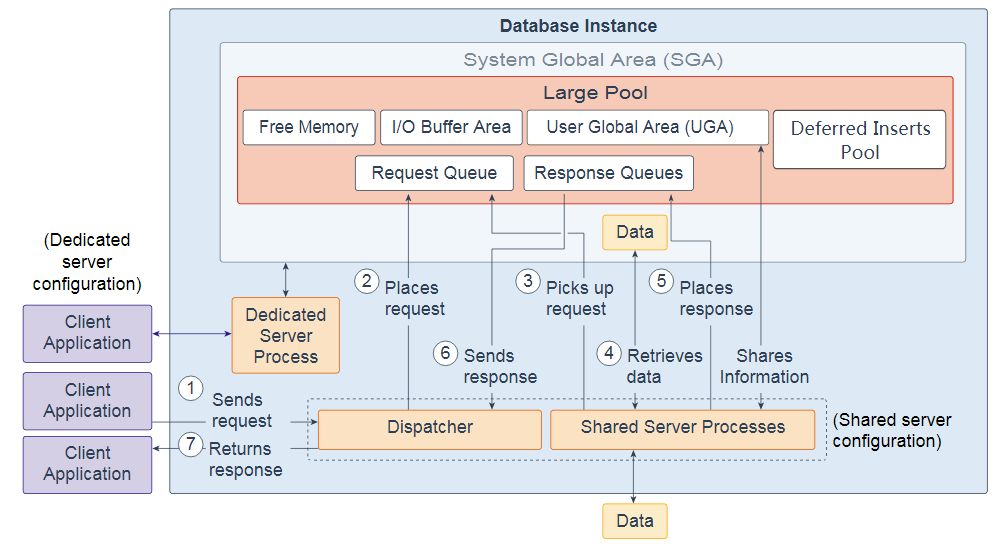 - 共享服务器进程对数据库进行所有必要的调⽤以完成请求。⾸先,共享服务器进程访问共享池中的库缓存以验证请求的项目;例如,它检查表是否存在,用户是否具有正确的特权等等。接下来,共享服务器进程访问缓冲区⾼速缓存以检索数据。如果数据不存在,则共享服务器进程将访问磁盘。不同的共享服务器进程可以处理每个数据库调⽤。因此,解析查询,获取第⼀行,获取下一行以及关闭结果集的请求可能分别由不同的共享服务器进程处理。由于不同的共享服务器进程可能会处理每个数据库调⽤,因此⽤户全局区域 (UGA) 必须是共享内存区域,因为UGA包含有关每个客户端会话的信 息。反过来说,UGA包含有关每个客户端会话的信息,并且必须对所有共享服务器进程可⽤,因为任何共享服务器进程都可以处理任何会话的数据库调用。