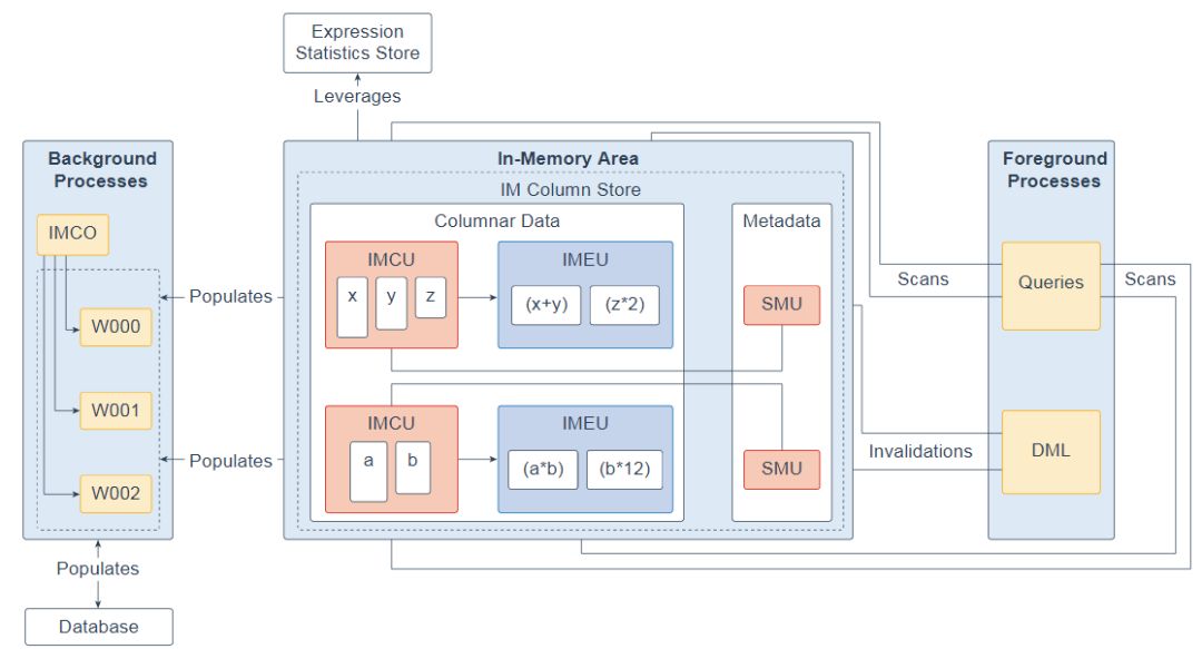 为了响应查询和数据操作语⾔(DML),服务器进程扫描列数据并更新SMU元数据。后台进程将磁盘中的行数据填充到IM列存储中。In-Memory协调进程(IMCO)是启动后台填充和重新填充列式数据的后台进程。空间管理协调进程(SMCO)和空间管理⼯作进程(Wnnn)是后台进程,它们代表IMCO实际填充和重新填充数据。DML块更改将写⼊缓冲区⾼速缓存,然后再写⼊磁盘。然后,后台进程根据元数据失效和查询请求将磁盘中的行数据重新填充到IM列存储中。