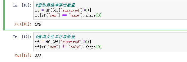 #查询男性幸存者数量 rf = df[(df["survived"]>0)] rf[rf["sex"] == "male"].shape[0] #查询女性幸存者数量 rf = df[(df["survived"]>0)] rf[rf["sex"] != "male"].shape[0]