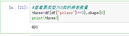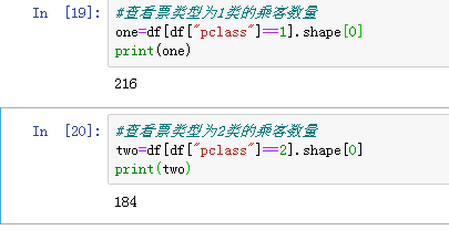 #查看票类型为1类的乘客数量 one=df[df["pclass"]==1].shape[0] print(one) #查看票类型为2类的乘客数量 two=df[df["pclass"]==2].shape[0] print(two)