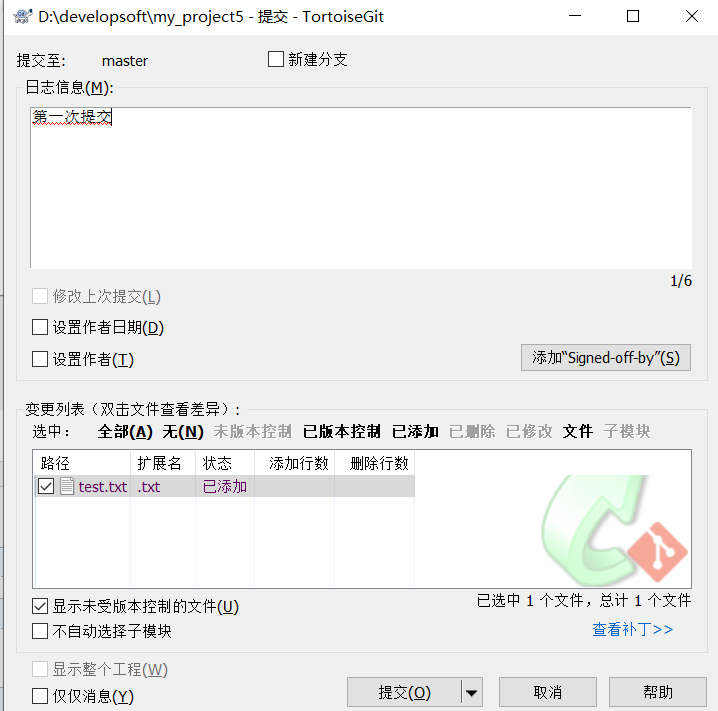 2,右键test.txt文件TortoiseGit(T)选择添加,点击确定