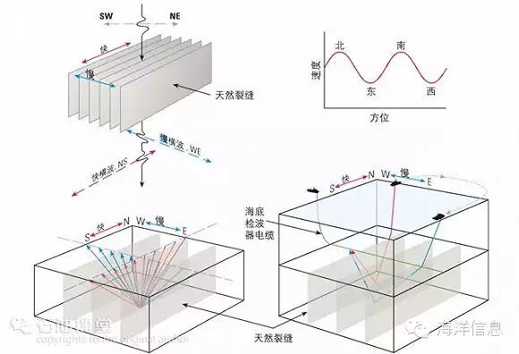 △左上角图中显示了南北走向的垂直裂缝,引起的快横波分离可以帮助确定快横波方向(红色箭头)和慢横波方向(蓝色箭头)。左下为陆上地震图,显示的是来自两个震源-检波器方向的共中心点道集射线,右下为海底地震图,表明地震各向异性的影响,在三维OBN地震勘探中,结合全方位角信息可以非常有效的对地下裂缝进行预测和解释