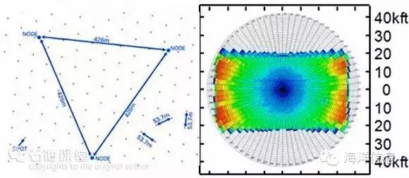 △OBN观测系统偏移距和方位角信息:左图中的小红点为炮点,蓝色点为节点,这种观测系统的偏移距更大;右侧玫瑰图清晰地展现了这种观测系统的偏移距、方位角和覆盖次数信息