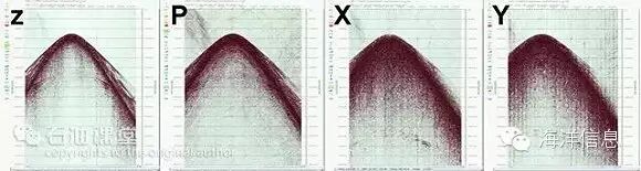 △从左到右依次为水听器分量Z,垂直压力分量P,水平分量X和Y其中Z分量用来接收垂直出射的纵波数据,是最常用的地震勘探资料;X分量和Y分量是用来接收转换横波数据,这是海底地震仪器所独有的。关于P波数据,它接收到的是一种标量的压力数据,现如今P波数据的最终目的是为了和Z分量数据作匹配叠加,分离上下行波。