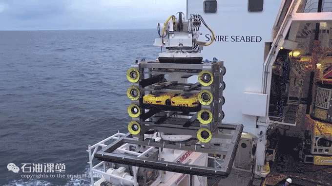 △运输节点的工作船2.2 布置节点海洋深邃而澎湃,如何克服各种不确定因素,将大批节点准确而快速的安放到海底预定位置呢?技术专家想到了TMS(Tether Management System,线缆管理系统)和ROV(Remotely Operated Vehicles,远程遥控机器人)设备。