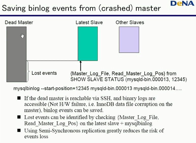 在提升一个从节点为主节点时,会事先合并所有从节点中的中继日志事件,然后将其应用到一个从节点上,使其作为新的主节点;