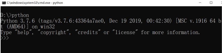 进入 Python 环境则安装成功。 (如果安装多个版本的 Python,会根据环境变量的位置进入,可以进入不同版本的 Python 文件 中,将 Python.exe 文件,创建快捷方式后重命名,如,改为:python3.7,后续可输入 Python3.7 进入 环境。)