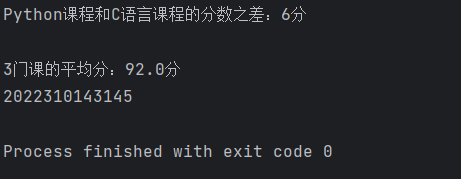 python =95 english =92 c =89 sub =python-c avg =(python+english+c)/3 print("Python课程和C语言课程的分数之差:"+str(sub)+"分\n") print("3门课的平均分:"+str(avg)+"分")