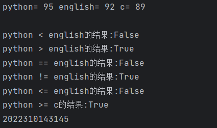 python = 95 english = 92 c = 89 print("python= "+str(python)+" english= "+str(english)+" c= "+str(c)+"\n") print("python < english的结果:" + str(python < english)) print("python > english的结果:" + str(python > english)) print("python == english的结果:" + str(python == english)) print("python != english的结果:" + str(python != english)) print("python <= english的结果:" + str(python <= english)) print("python >= c的结果:" + str(python>=c))