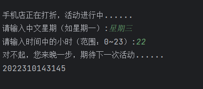 print("\n手机店正在打折,活动进行中......") strWeek = input("请输入中文星期(如星期一):") intTime = int(input("请输入时间中的小时(范围:0~23):")) if (strWeek == "星期二" and (intTime >= 10 and intTime <=11)) or (strWeek == "星期五" and (intTime >=14 and intTime <=15)): print("恭喜您,获得了折扣活动参与资格,快快选购吧!") else: print("对不起,您来晚一步,期待下一次活动......")