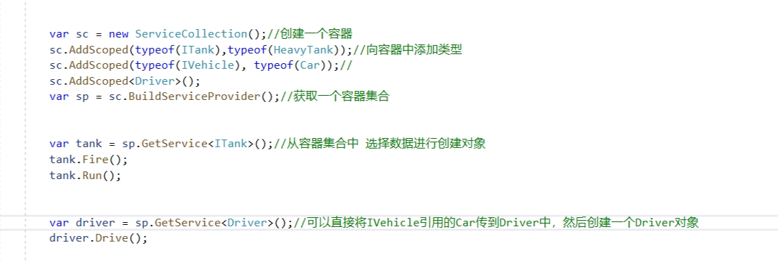 可以使用一些依赖注入框架来简化依赖注入过程,如Microsoft.Extensions.DependencyInjection插件,是为了解耦,将依赖的对象放到容器中去