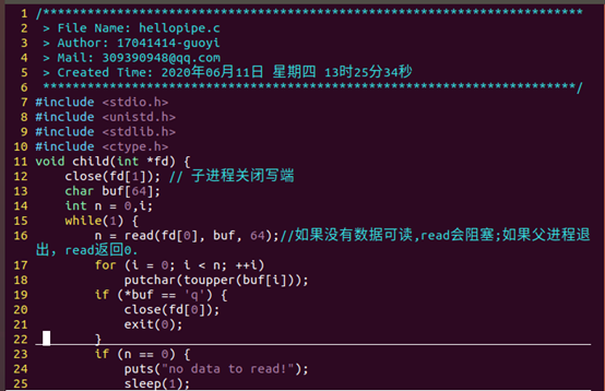 例题:父进程 fork 出一个子进程,通过无名管道向子进程发送字符,子进程收到数据后将字符串中的 小写字符转换成大写并输出