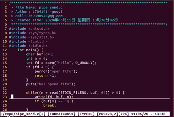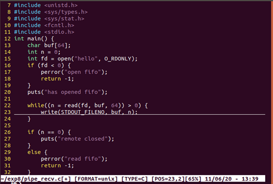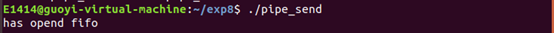 当然了,如果在 open 的时候,使用了非阻塞方式,肯定是不会阻塞的。特别地,如果以非阻塞写的方 式 open ,同时没有进程为该文件以读的方式打开,会导致 open 返回错误(-1),同时 errno 设置成 ENXIO . 例题:编写两个程序,分别是发送端 pipe_send 和接收端面 pipe_recv 。程序 pipe_send 从标准 输入接收字符,并发送到程序 pipe_recv ,同时 pipe_recv 将接收到的字符打印到屏幕。