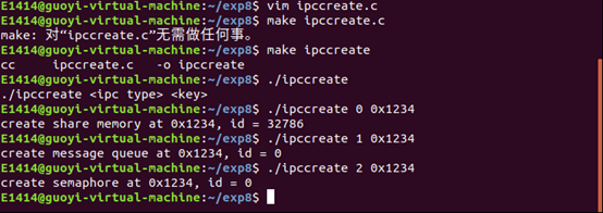 例题:程序 ipccreate 用于在指定的键值上创建 ipc 内核对象。使用格式为 ./ipccreate ,比如 ./ipccreate 0 0x8888 表示在键值 0x8888 上创建共享内存