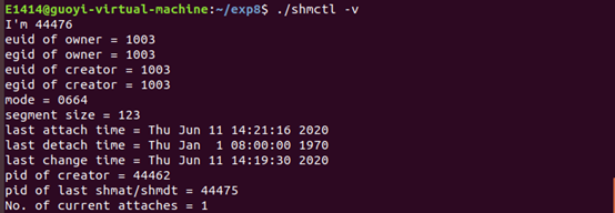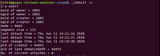 先在另一个终端执行 ./shmctl -a ,然后在当前终端执行 ./shmctl -v (注意手速,5秒内要搞定)。