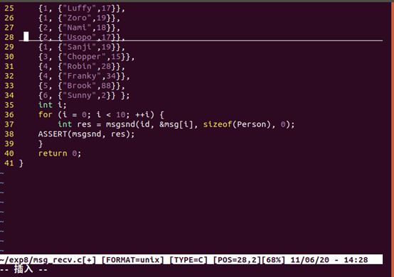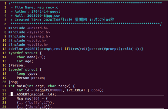 msg_send 程序定义了 一个结构体 Msg ,消息正文部分是结构体 Person 。该程序向消息队列发送了 10 条消息。