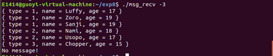 msg_recv 程序接收一个参数,表示接收哪种类型的消息。比如 ./msg_recv 4 表示接收类型为 4 的消 息,并打印在屏幕