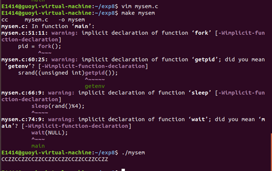 这里可以看到字符是成对出现的,如果大家修改程序把57行 sem_p();和64行 sem_v();注释掉,