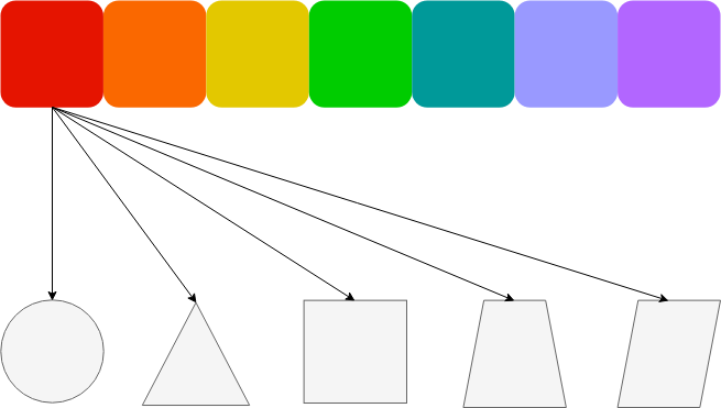 注意,上图只画出了红色和形状的组合,其他颜色亦是如此,其中7种颜色以及5种形状的组合就达到了35种,而此处我们只需要7+5个类便可以实现。试想如果有更多的颜色和形状,且没有这种松散分离的结构要多少个类来实现?那将会是一场噩梦。有没有发现这就是笛卡儿积的组合,来看我们的代码中的两个集合: