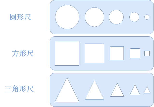 对于具体的尺子类,我们暂且忽略其大小,一种形状就对应一个类,分别是方形、三角形、还有圆形,它们统统实现尺子的规则接口。