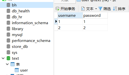 打开navicat,在里面创建一个数据库和一个表,这里创建了一个叫做text的数据库和一个叫user的表
