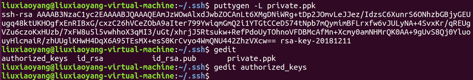 使用 ssh-keygen 命令在Linux生成.ssh目录,在.ssh下新建密钥存储文件authorized_keys,并复制私钥文件到.ssh目录下。使用命令 puttygen -L “拷贝私钥文件” ,将内容拷贝到authorized_keys文件中。